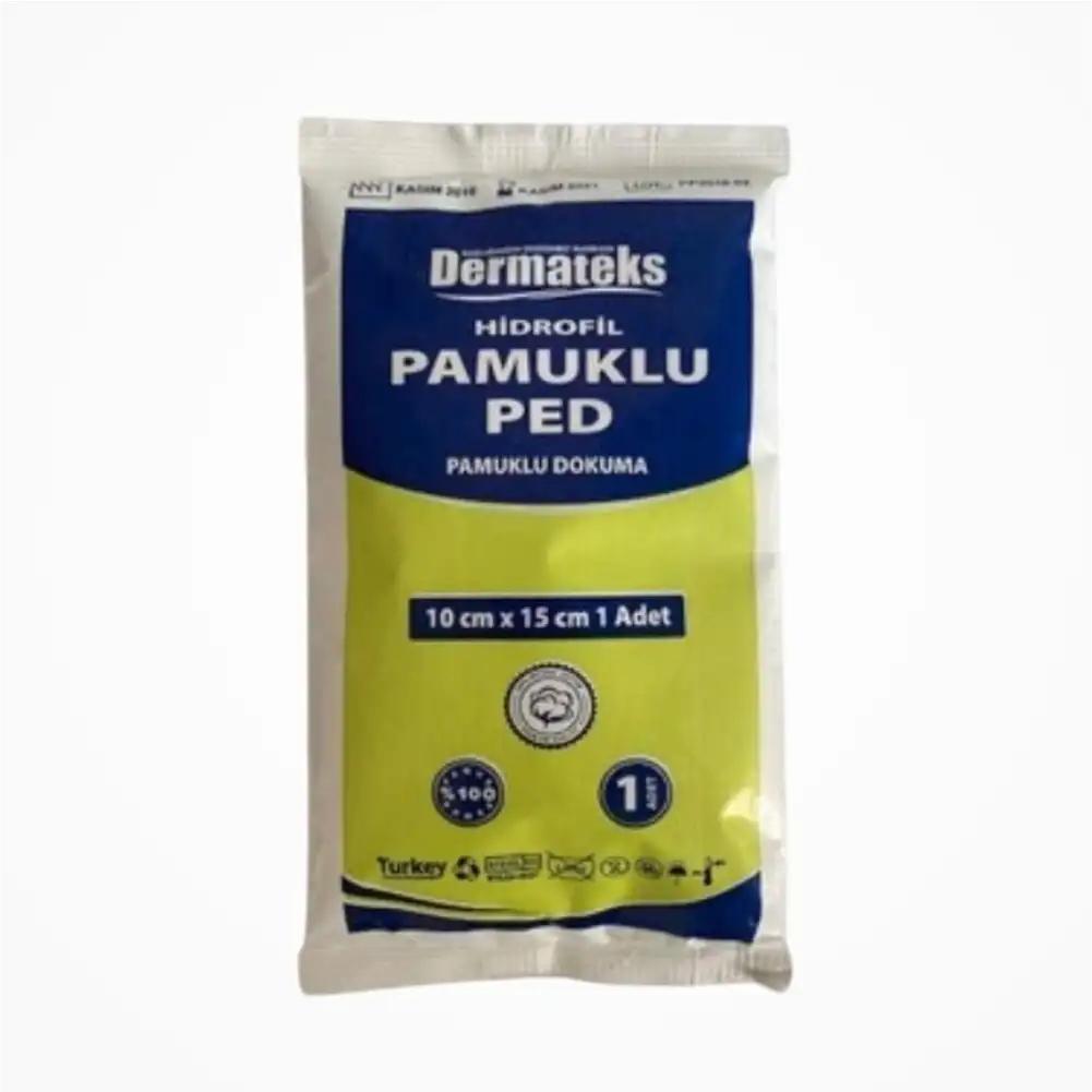 Dermateks Steril Pamuklu Ped 10cm x 15cm, yüksek emiciliğe sahip hidrofil yapısıyla yara bakımı ve pansuman işlemlerinde kullanılan steril bir medikal peddir. İç kısmı saf pamuk dolgulu, dış yüzeyi gazlı bez kaplamalıdır.
