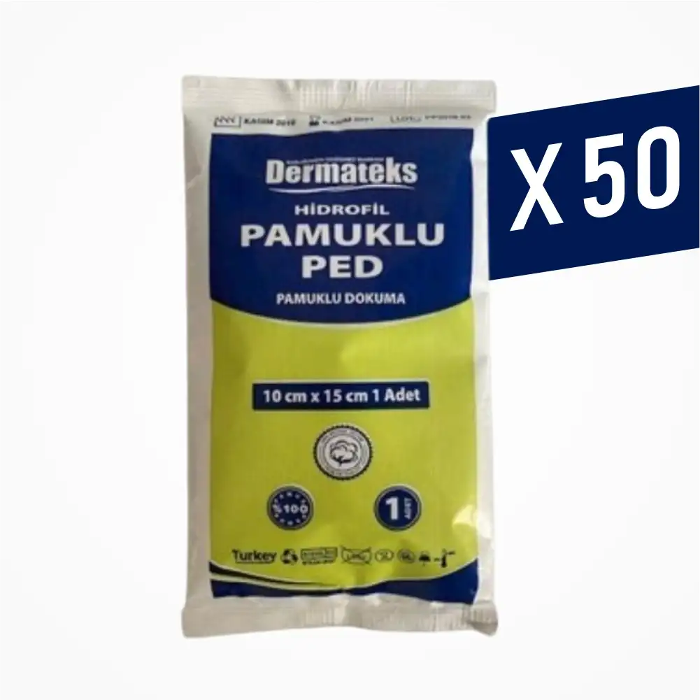 Dermateks Steril Pamuklu Ped 10cm x 15cm, yüksek emiciliğe sahip hidrofil yapısıyla yara bakımı ve pansuman işlemlerinde kullanılan steril bir medikal peddir. İç kısmı saf pamuk dolgulu, dış yüzeyi gazlı bez kaplamalıdır.
