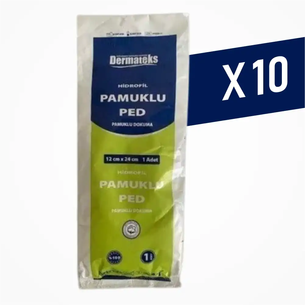 Dermateks Steril Pamuklu Ped 12cm x 24cm, yüksek emiciliğe sahip hidrofil yapısıyla pansuman ve yara bakımında kullanılan steril bir tıbbi ped ürünüdür. İç kısmı saf pamuk dolgulu, dış yüzeyi gazlı bez kaplamalıdır.