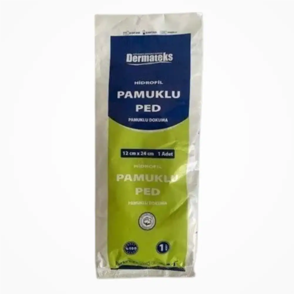 Dermateks Steril Pamuklu Ped 12cm x 24cm, yüksek emiciliğe sahip hidrofil yapısıyla pansuman ve yara bakımında kullanılan steril bir tıbbi ped ürünüdür. İç kısmı saf pamuk dolgulu, dış yüzeyi gazlı bez kaplamalıdır.