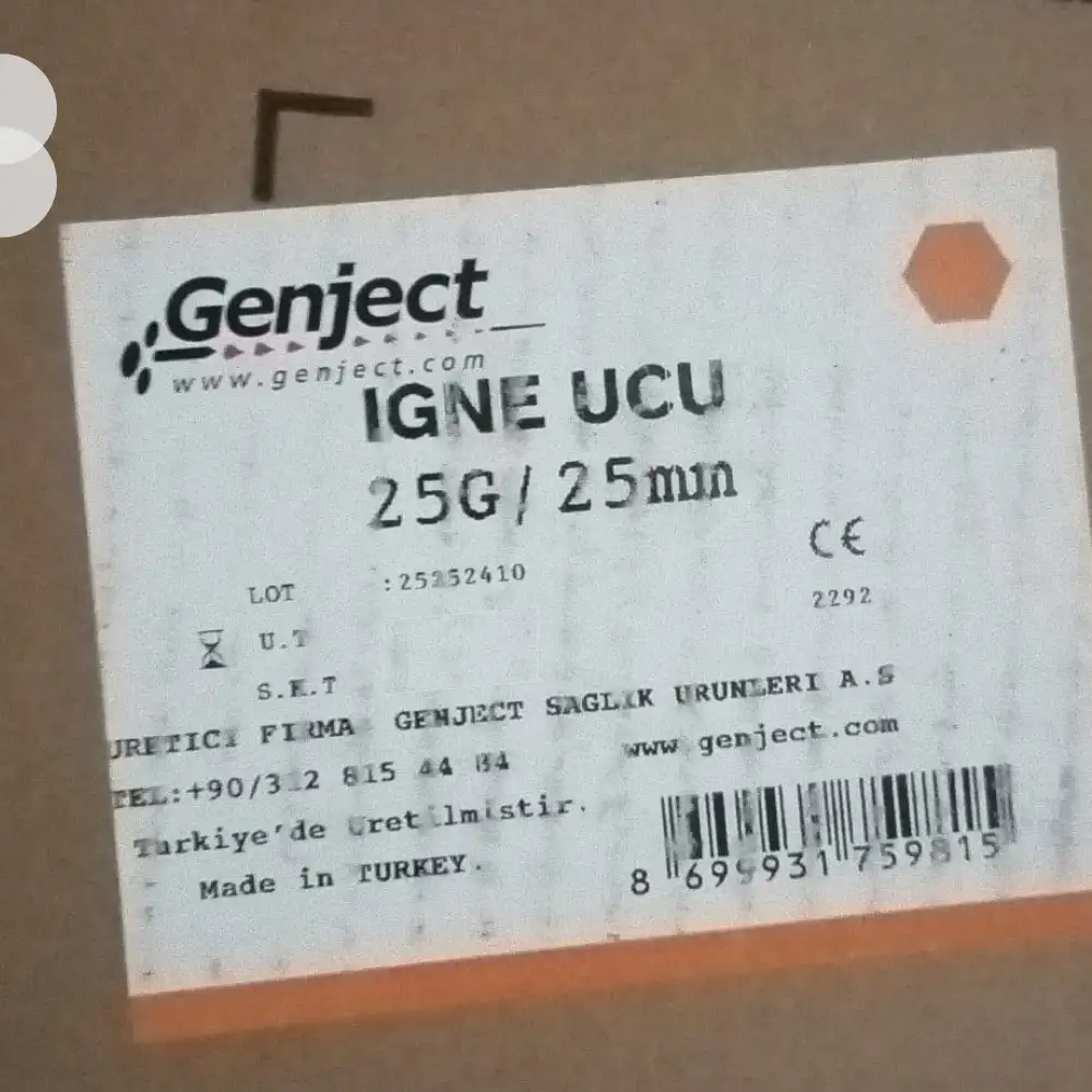 Genject İğne Ucu Turuncu (25G/25mm),enjeksiyon uygulamalarında kullanılan tek kullanımlık steril iğne ucudur. 25G kalınlığı ve 25 mm uzunluğu sayesinde daha ince ve kontrollü uygulamalar için uygundur.