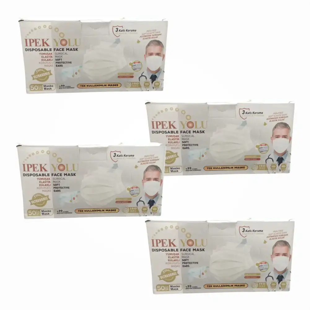 Medikal Tek Kullanımlık Maske 3 Katlı Telli Meltblown Filtreli Beyaz 50'li Kutu x 4 Kutu