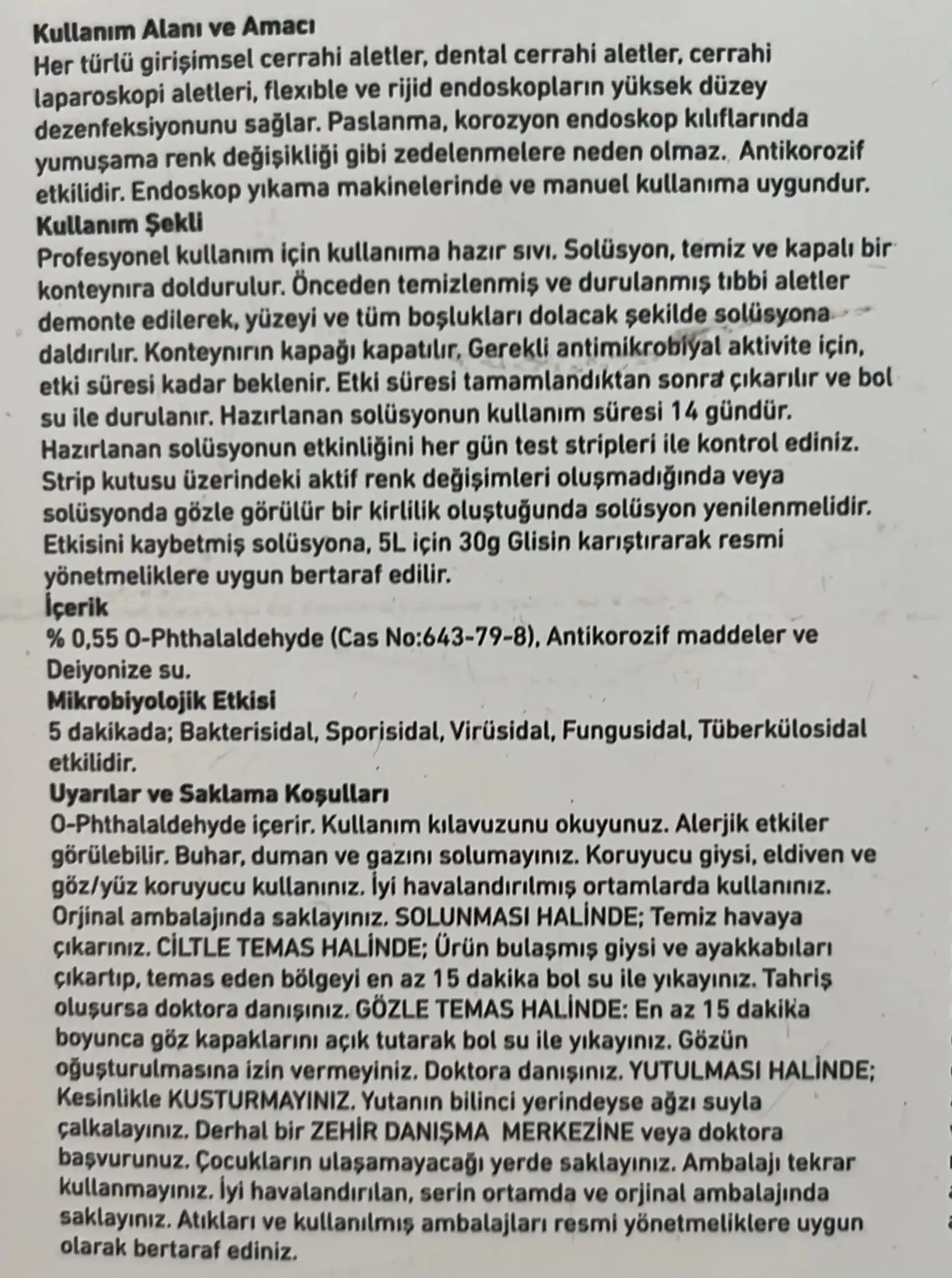 İçerik: %0,55 O-Phthalaldehyde, korozyon inhibitörleri ve deiyonize su.